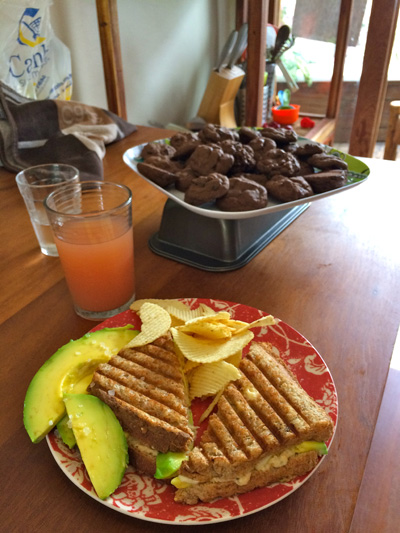 Avocado, red onion and cheese paninis with guava juice, and double chocolate chip cookies. BAM!