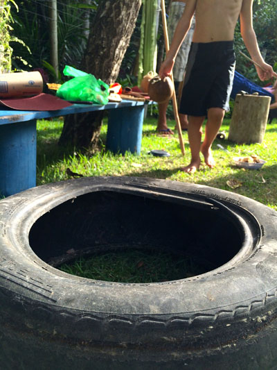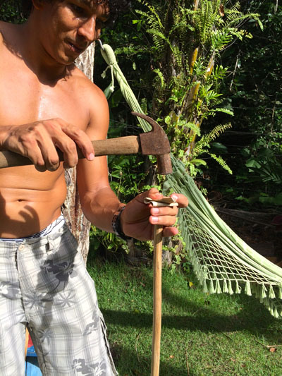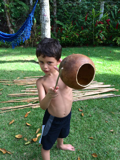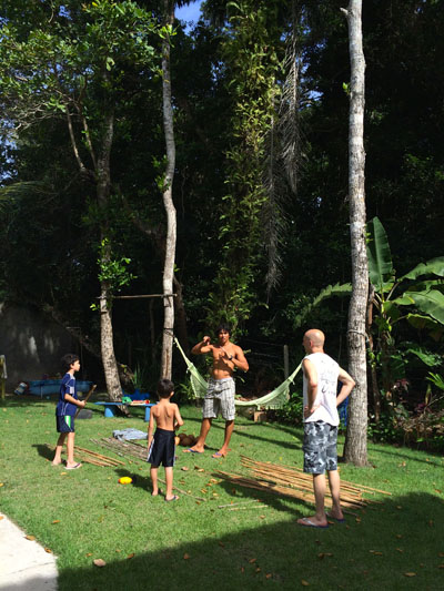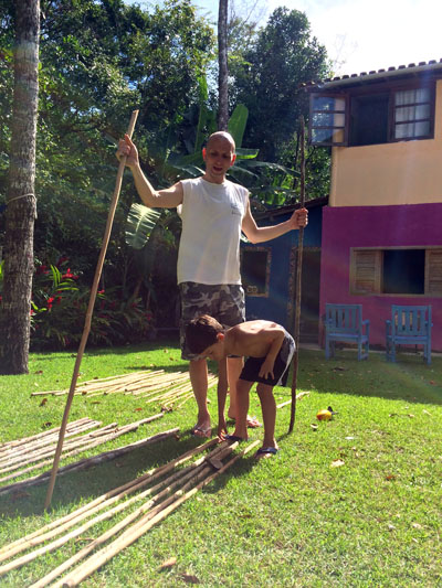 It started raining outside. We were about to go on a snorkeling trip to Recife de Fora. So we were about to get ready when the Arraial Trip Tur guy came and said that we can’t on on the trip because of the rain. Then we really couldn’t go. We went back in to the house. I was really disappointed. After school we went to my capoiera teacher’s house. His name is Deivid. We were going to make berimbaus! First we chose the stick that we thought was right for us. Then we would sandpaper it. There’s a lot of sandpapering in here. Then we picked a gourd to hollow out. Then we would string it. After that we made a baqueta. Then bam! We made our own berimbau! That really changed my day. You can see the whole process in pictures on my dad’s post.